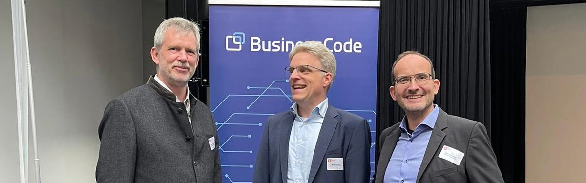 Bildunterschrift: Dr. Schulte-Beckhausen mit den BusinessCode CEOS Martin Schulze und Martin Bernemann bei der Veranstaltung in Siegburg