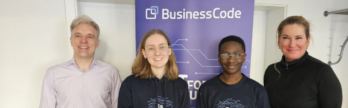 Beitragsbild: Martin Schulze (CEO BusinessCode), Anna R. (BusinessCode), Michael A. Adeolu (Praktikant) und Antje Gräf (Lehrerin Clara-Schumann-Gymnasium)