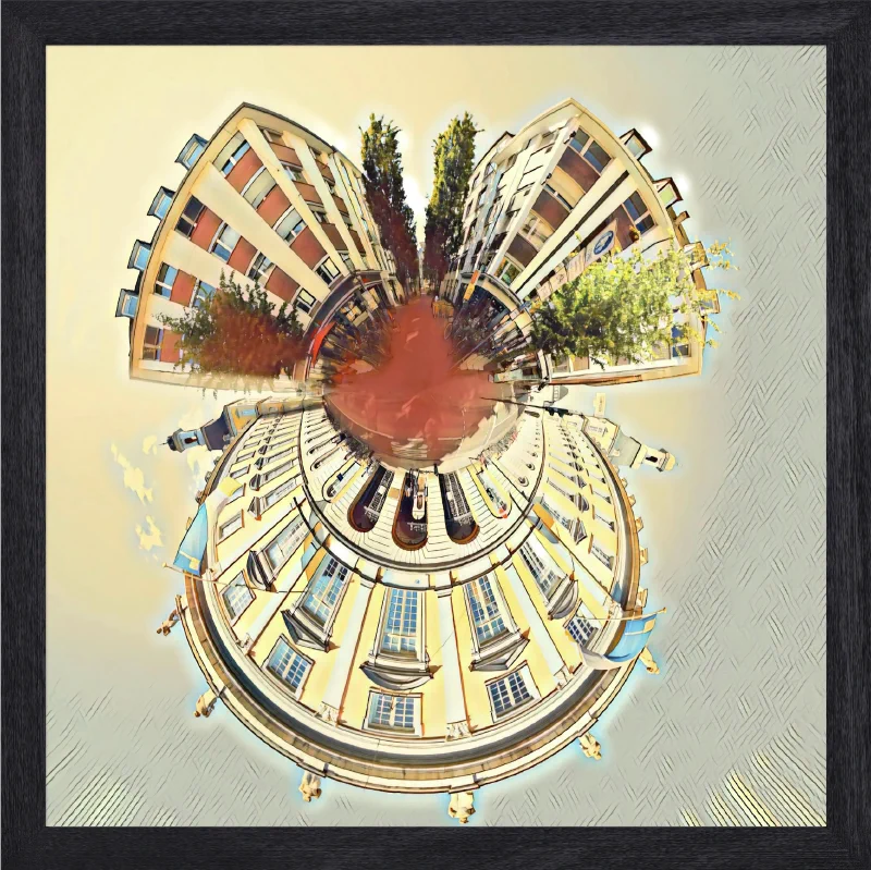 „Die Bilder für BusinessCode bestehen jeweils aus einer Aufnahme eines 360° Panorama-Bildes. Diese setzt sich aus ca. 20 Einzelbildern zusammen“, erklärt Wagener. „Der nächste Schritt war das Zusammensetzen des Panoramas, um so einen Planeten zu erzeugen, also quasi das Panorama auf eine Kugel spannen. Dann habe ich noch einen künstlerischen Effekt hinzugefügt, da wir eher ein Gemälde denn ein Foto haben wollten.“