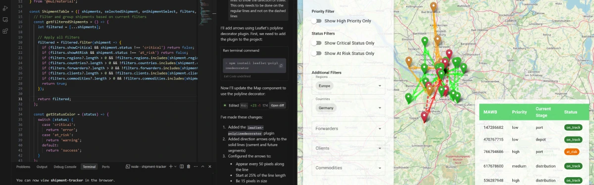 Am Ende des Workshops konnten wir erfolgreich eine funktionale Webanwendung entwickeln, die mit Node.js und React betrieben wird. Die KI des Windsurf Editors generierte alle notwendigen Komponenten, von der Backend-Struktur bis zur Benutzeroberfläche im Frontend. Die Anwendung umfasste Funktionen zur Sendungsverfolgung sowie eine einfache Möglichkeit, schnell einen Überblick über kritische oder gefährdete Lieferungen zu erhalten.